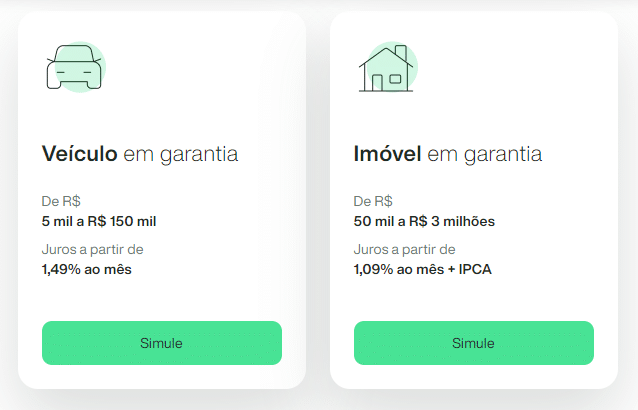 - Escolha o empréstimo com garantia de imóvel ou veículo e clique em “Simule”;